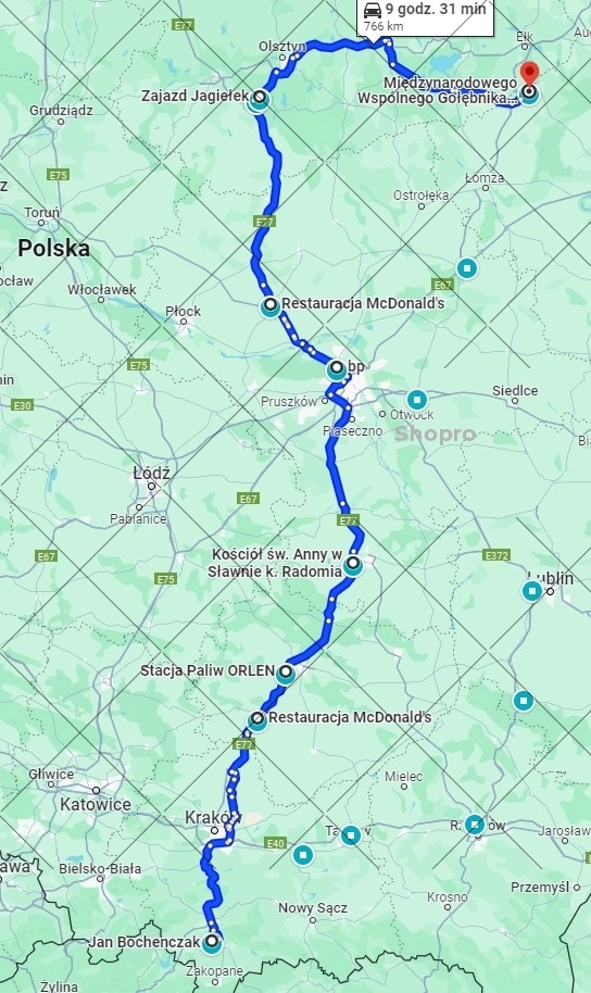 Start środa 8.00 WG Giewont przez Kielce, Radom, Warszawa, Olsztynek na WG Mazury.